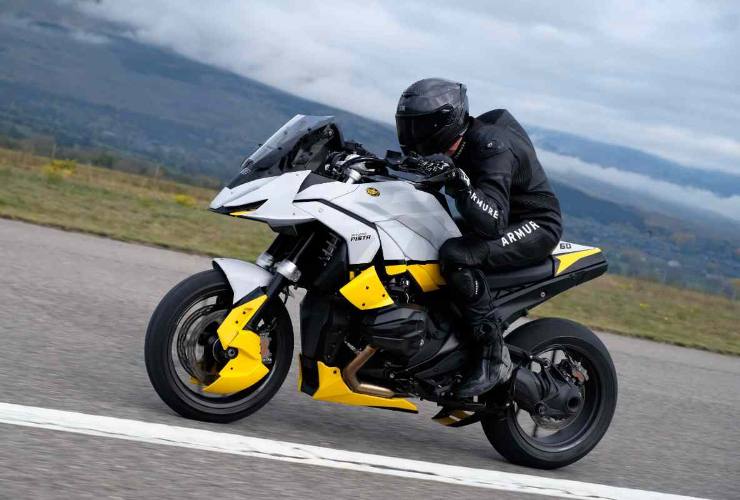 Il frontale della moto è accorciato, regalando un taglio più sportivo. Il cupolino si allunga e le prese d’aria in stile racing sono diverse per far respirare un animale concepito per la pista. L’impianto frenante della maxi-enduro di BMW è imponente, con pinze radiali Brembo a quattro pistoncini. Non mancano cerchioni in carbonio da 17″ sia all’anteriore che al posteriore. La moto monta delle mescole Pirelli Diablo. Il motore ruggisce sotto il cofano ma non cambia rispetto all’originale. Il sound è impreziosito da uno scarico Arrow.