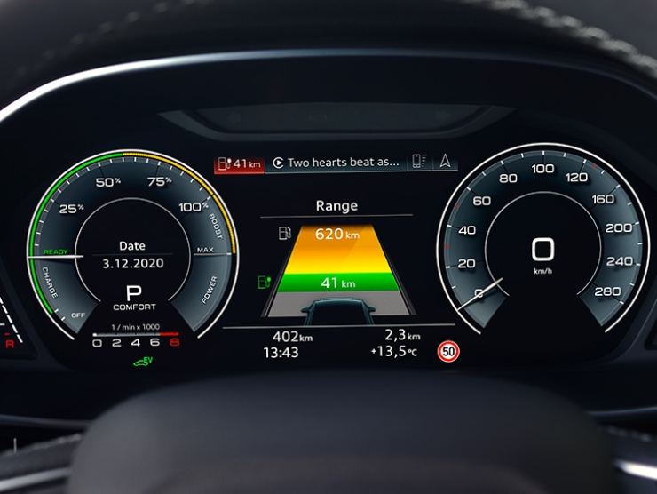 L’Audi, è in grado di sfruttare i due motori, singolarmente o contemporaneamente, in base alla carica della batteria, ed alla volontà del guidatore. Si può scegliere tra quattro diverse modalità di guida, la EV, totalmente elettrica che garantisce una percorrenza massima di circa 50 km, ad una velocità massima di 140 km/h.