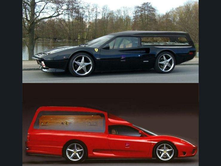 Il podio di questa classifica, secondo noi, spetta in assoluto al veicolo più iconico della storia, trasformato in carro funebre da una “onoranze funebri” inglese. Si tratta di due modelli Ferrari una 308, ed una 360 Modena.