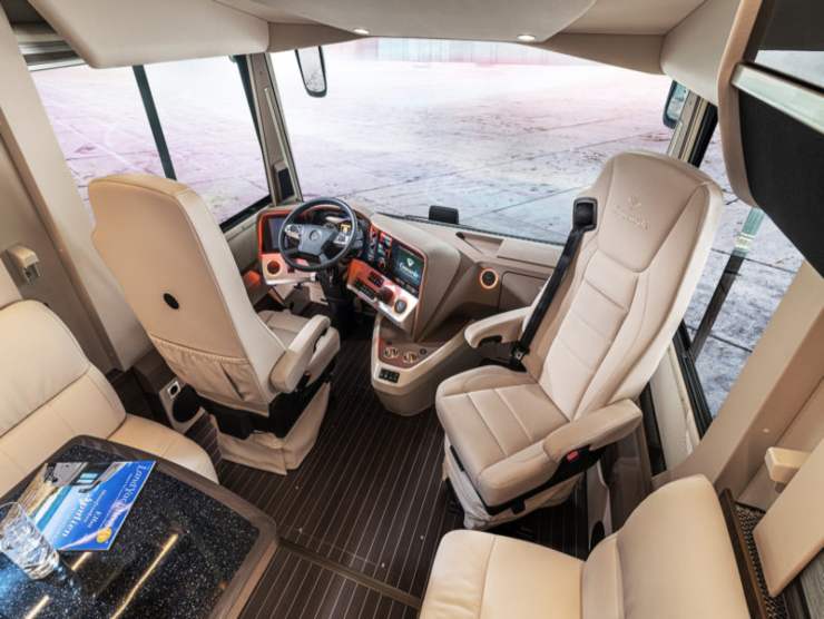 Pesa 7,5 tonnellate, è lungo quasi 12 metri e largo 2,50. Il suo aspetto, come si può facilmente comprendere dalle misure, è veramente notevole. Basato sul Mercedes Atego, è dotato di un affidabile motore a sei cilindri in linea da 299 Cv. Questo mezzo non è solo estetica e potenza, però. Anche gli interni sono mozzafiato.