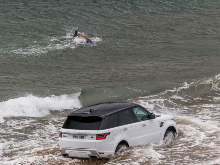 L’ultima prova dura è toccata al Land Rover, come detto, che ha celebrato il debutto del restyling della Range Rover Sport. Il nuovo Suv britannico ha sfidato due nuotatori in mare aperto.