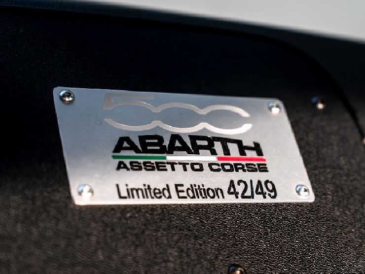 Un pezzo rarissimo per la Fiat 500 Abarth assetto corse 42/49 Stradale del 2013. Si tratta dell’unico, tra i 49 esemplari realizzati, ad essere omologato e immatricolato per circolare su strada. Peraltro, l’auto non ha mai corso in pista.
