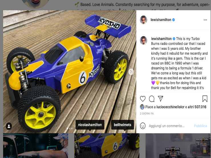 “Questa è la mia auto radiocomandata Turbo Burns che ho corso quando avevo 5 anni. Mio fratello l’ha gentilmente fatto ricostruire per me di recente e funziona come un gioiello. Questa è l’auto con cui ho corso alla BBC nel 1990, quando sognavo di diventare un pilota di Formula 1. Abbiamo fatto molta strada, ma questo mi entusiasma ancora come quando ero bambino, grazie fratello per averlo fatto e grazie per Bell per averlo ridipinto con i colori originali.”