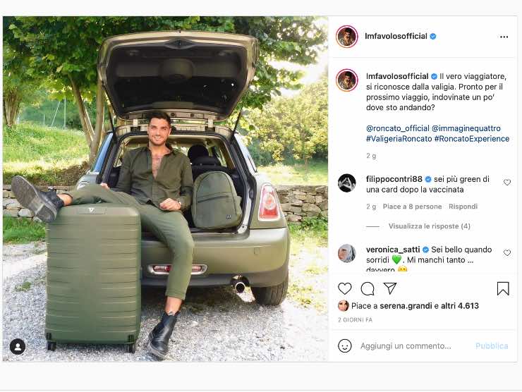 Ma ormai si vive su Instagram. Infatti il bel Favoloso ha ripreso la sua carriera di modello e testimonial comunicandolo proprio sul social in questione, facendo bella mostra di sé con il corredo di una valigia Roncato. Possiamo ammirarlo in posa plastica seduto nel baule aperto di una Mini Cooper prima serie, modificata per essere in tinta con la valigia pubblicizzata.