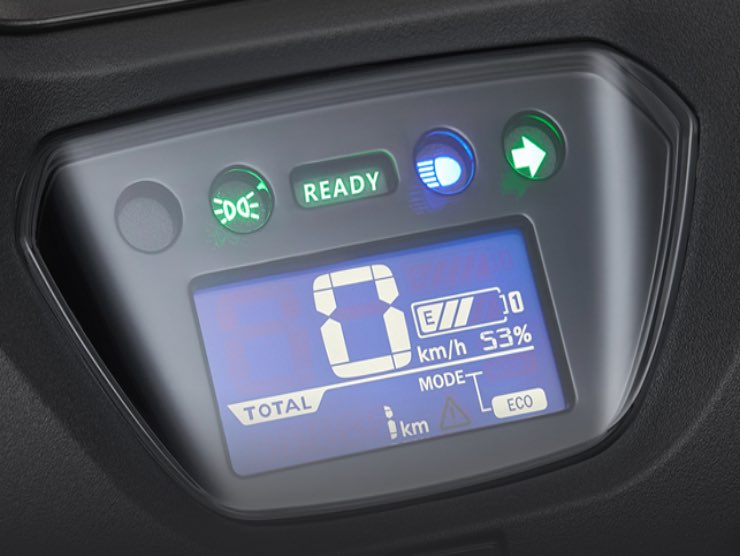 La variante normale offre una velocità massima di 53 km/h. I compiti di sospensione sullo scooter elettrico sono gestiti da forcelle telescopiche anteriori e doppi ammortizzatori posteriori con regolazione del precarico. L’hardware di frenatura comprende un freno a disco nella parte anteriore e un freno a tamburo nella parte posteriore. Ha un’altezza del sedile molto accessibile di 740 mm.
