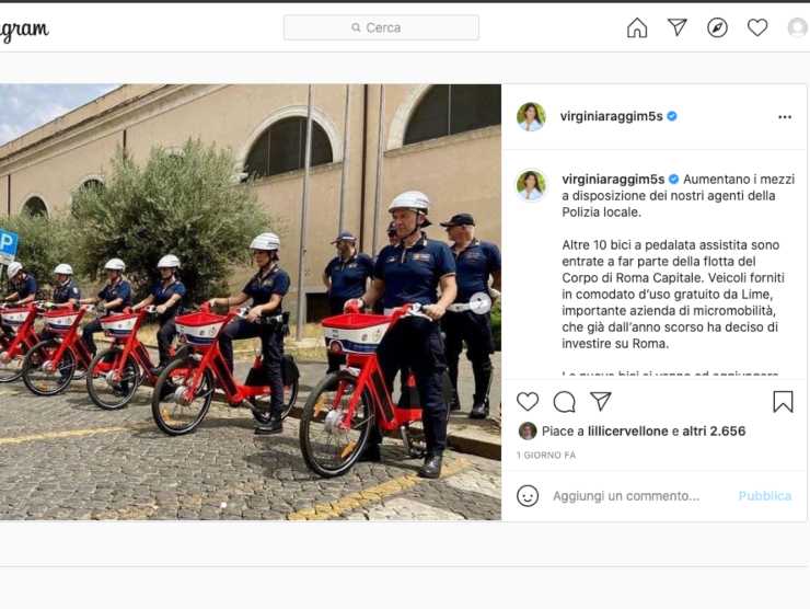 La sindaca di Roma Virginia Raggi pubblica sul suo personale profilo Instagram un post che ritrae alcuni agenti della Polizia Municipale con i nuovi veicoli elettrici messi a disposizione dalla Lime, azienda della micromobilità. Così dichiara la giovane sindaca.