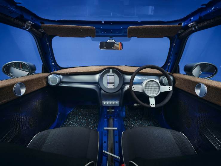 La base di partenza per questa nuova vettura è la Mini Cooper SE, smontata e ridotta all’essenziale. Successivamente, gli elementi rimasti sono stati resi più lussuosi dal designer britannico, con sempre la sostenibilità al centro di tutto.