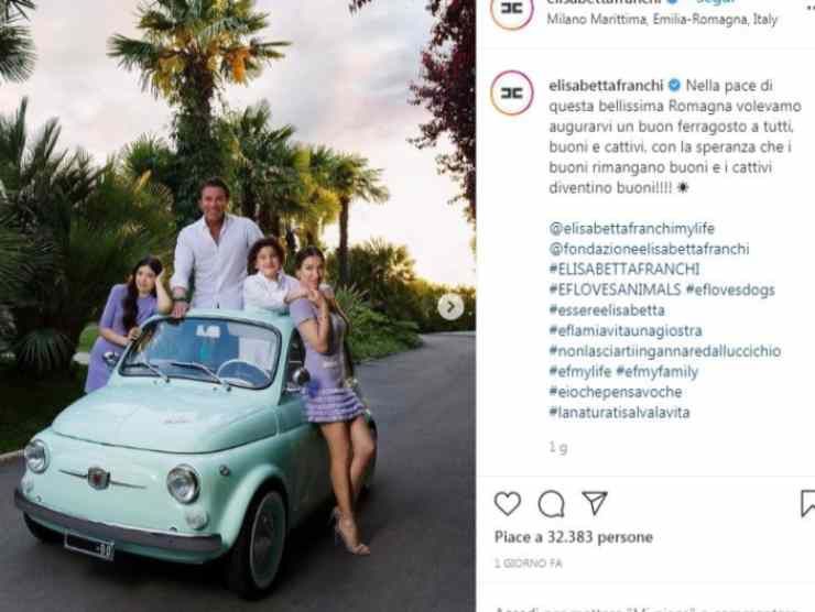 “Nella pace di questa bellissima Romagna volevamo augurarvi un buon ferragosto a tutti, buoni e cattivi, con la speranza che i buoni rimangano buoni e i cattivi diventino buoni!!!!” è scritto nel post con la Fiat 500. Elisabetta Franchi, infatti, ha due residenze estive, a Cortina e a Milano Marittima, appunto.