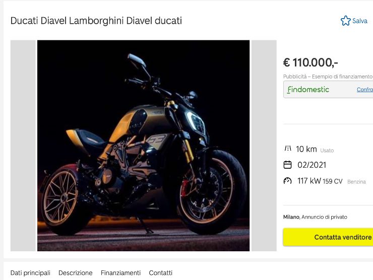Proprio sulla qualità della moto e sulla sua rarità punta il venditore che ha messo a disposizione il mezzo su AutoScout 24. Si tratta della moto numero 2 del 2021. Alimentata a benzina, 159 CV. Stando a quanto indicato su AutoScout 24, la moto ha percorso solo dieci chilometri.