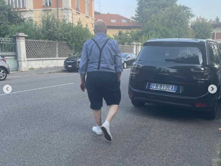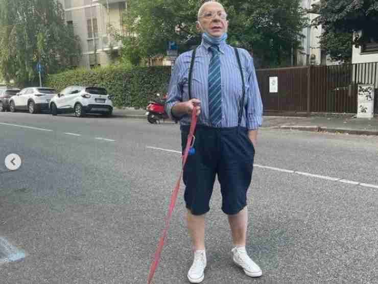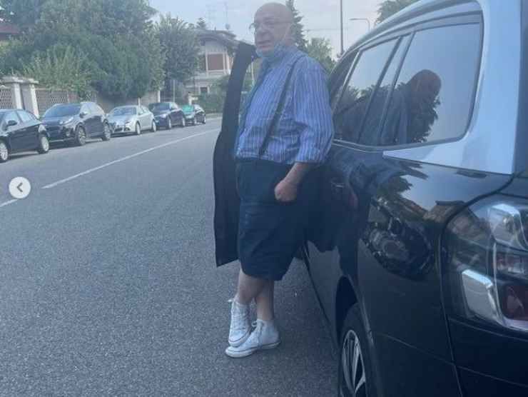 Lo vediamo in bermuda, camicia, cravatte e bretelle in strada, con un bellissimo cagnolino di colore nero. Ma nelle varie foto pubblicate da Coruzzi-Platinette, scorgiamo anche l’auto del personaggio televisivo.