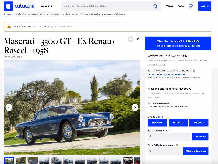 Su Catawiki troviamo in vendita all’asta una Maserati 3500 GT, che fu acquistata a Modena il 18 aprile del 1958. Secondo quanto leggiamo sulla scheda del portale di vendita, la storia dell’auto è molto ben documentata.