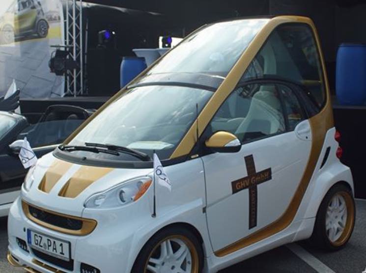 L’auto dunque sarebbe una sorta di omaggio – forse non proprio riuscito bene – al Pontefice stesso o una semplice personalizzazione di una Smart ad opera di estrosi proprietari che stando alla targa arriverebbero dalla Germania.