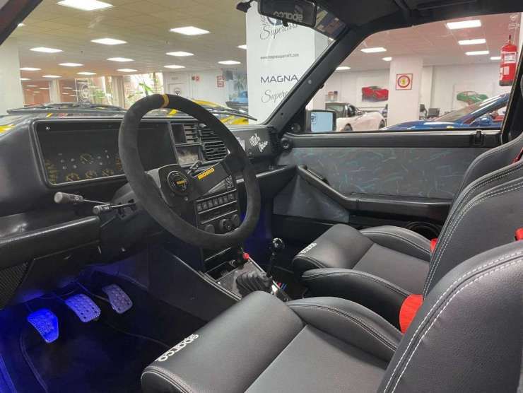 Cambio manuale 5 marce con cambio in fibra di carbonio base rally Lancia Delta. Versione HF integrale 16v turbo 200cv. Cerchi da 17″ bianchi Speedline corse. Nuovi pneumatici Michelin Sport e ruote Momo rally in Alcantara. Paraurti anteriore Evoluzione, così come l’ala posteriore Evoluzione original.