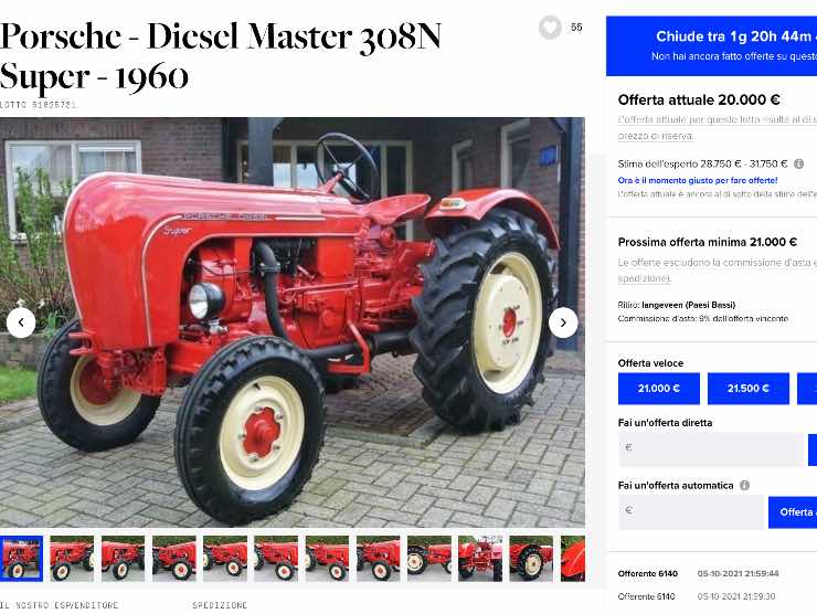 Il Porsche Super 308 in vendita all’asta su Katawiki ha cerchi grandi con bellissimi pneumatici nuovi. Dotato di assale anteriore regolabile e dispositivo di sollevamento più 3 alberi per la presa di potenza. Motorino di avviamento, alternatore e batteria nuovi.