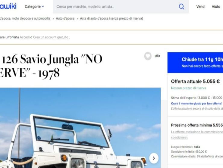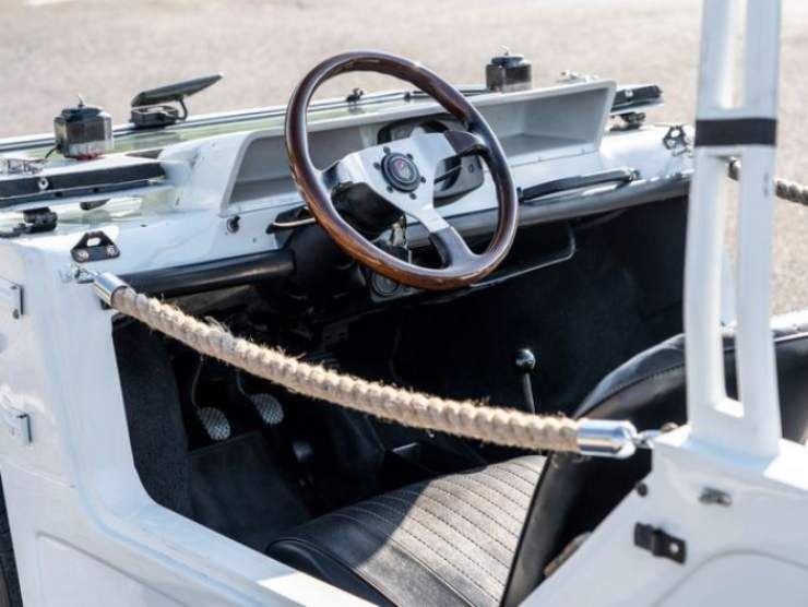 L’auto, del 1978, ha percorso 53676 km. Di colore bianco, cambio manuale e alimentazione a benzina. 652cc di cilindrata per 25 cavalli. Su Katawiki attualmente la troviamo in vendita all’asta a poco più di 5mila euro.