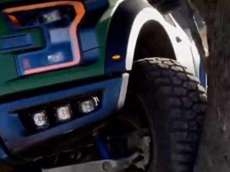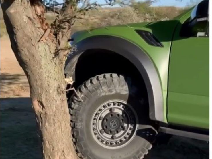 Sì perché vediamo questo fuoristrada di colore verde che, con le sue ruote, di fatto si arrampica su un alberello. Ruote che, per intenderci, sono più spesse dello stesso spessore del tronco dell’albero. L’auto accelera, scatena la propria forza propulsiva e arrampicatrice.