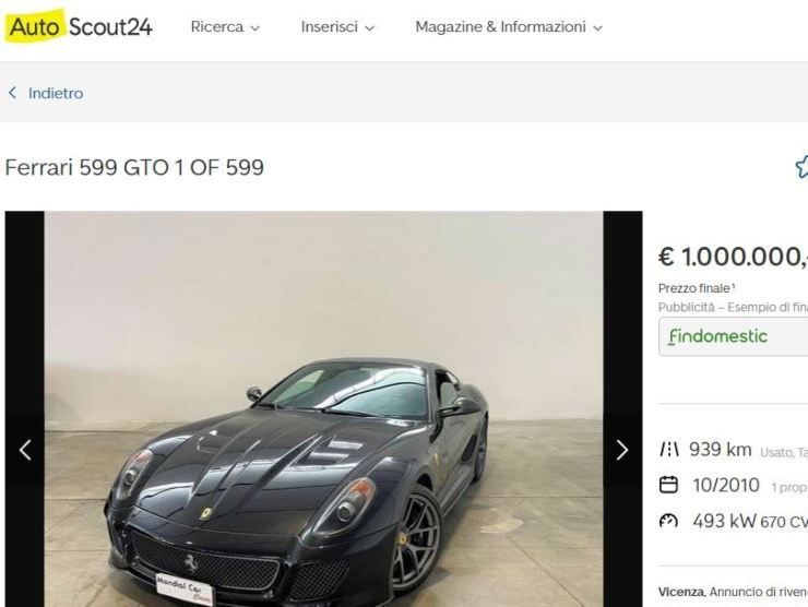 E’ in vendita su AutoScout 24. Ma il prezzo forse è meglio che ve lo diciamo dopo. E capirete perché. Per ora parliamo della caratteristiche di questa Ferrari 599 GTO. Che sono da urlo.