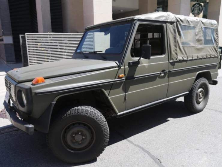 Si tratta di un Puch 230 GE del 1991, originariamente utilizzato dall’esercito svizzero prima di essere dismesso nel 2013 e acquisito dall’attuale proprietario. Il Puch era il risultato di una collaborazione tra Daimler-Benz e il conglomerato austriaco Steyr-Daimler-Puch.