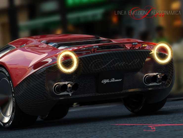 Sul posteriore, poi, come non notare gli scarichi che suggeriscono un motore molto potente. Difatti, si potrebbe usare sia un V6, ma anche un V8 grazie soprattutto alla presenza del Quadrifoglio, che farebbe di questa supercar un altro esempio di grande stile unito alla velocità.