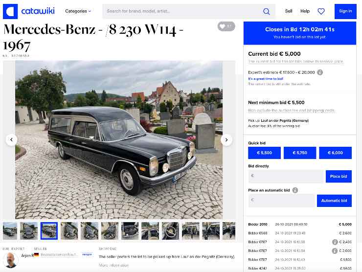 E’ un carro funebre. Sì, avete capito bene. Un carro funebre prodotto da Mercedes-Benz, basato sulla Mercedes /8. Il grande carro funebre W114 230 Pollmann a 6 cilindri si trova in vendita su Catawiki. Il mezzo è stato fabbricato nel 1967 da Daimler-Benz. Esteso al montante B e consegnato a Pollmann e convertito e ampliato secondo le esigenze del cliente.
