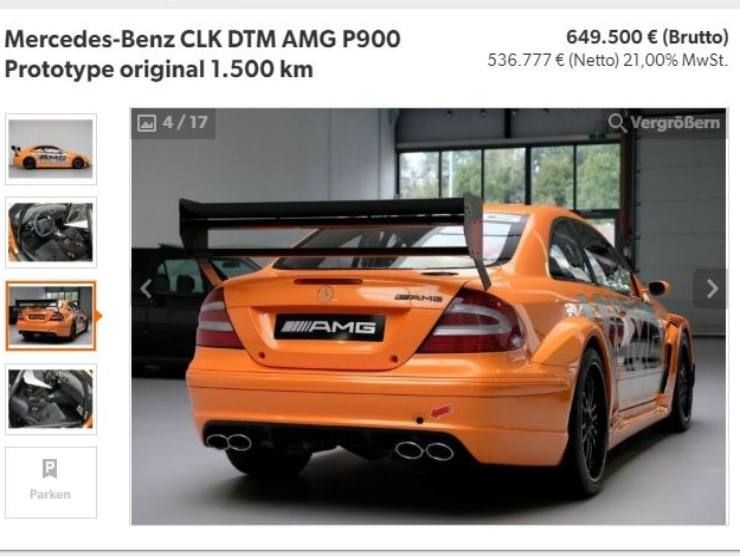 La Mercedes-Benz CLK DTM AMG P900 in vendita sul portale mobile.de ha un prezzo di 649.500 € lordi. Il prezzo netto è di 536.777 €.