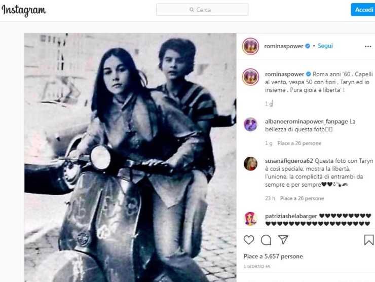 Proprio la sorella è protagonista di uno degli ultimi post pubblicati da Romina su Instagram. “Roma anni ‘60. Capelli al vento, Vespa 50 con fiori, Taryn ed io insieme. Pura gioia e libertà!”. Nel post, quindi, Romina è malinconica e ricorda la giovinezza insieme alla sorellina.