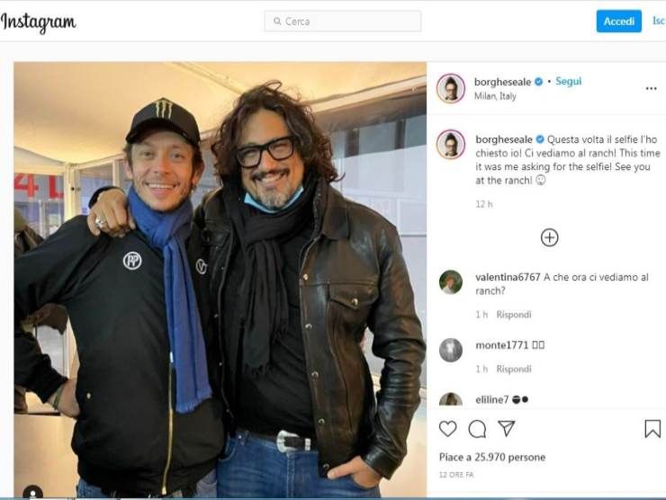 “Questa volta il selfie l’ho chiesto io! Ci vediamo al ranch!” scrive come messaggio di accompagnamento alla foto, Alessandro Borghese. Sì, perché questa volta, però, il fan è lui. E lo ammette con candore in uno degli ultimi post pubblicati sul proprio seguitissimo profilo Instagram. Eccolo con il “Dottore” per eccellenza. Valentino Rossi, recentemente ritiratosi dalle corse.