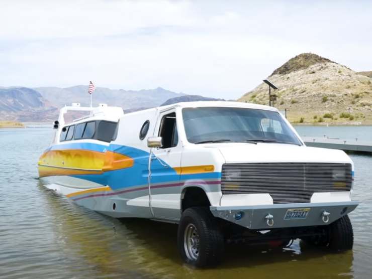 Spazioso e abitabile con una zona pranzo, un bagno, una doccia e molti mobili versatili che si trasformano in letti a castello, come un tavolo da cucina che si trasforma in un letto. Il Boaterhome monta un motore fuoribordo Mercury Marine DFI da 200 CV. La barca in vetroresina può raggiungere velocità fino a 64,3 km/h. Mentre è su strada, l’ibrido van-boat raggiunge il massimo a 161 km/h.