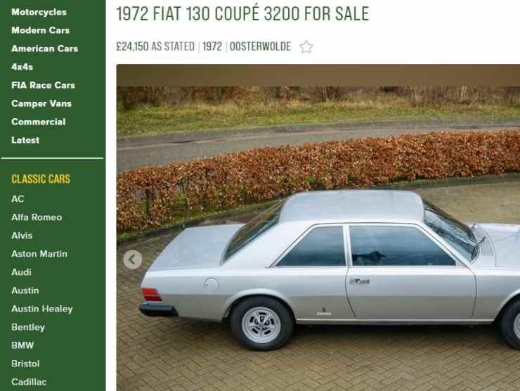Fiat 130 Coupé 3200 presente su Car and classic è del giugno 1972. Numero di telaio 0000705. Colore argento metallizzato abbinato ad interni in pelle nera e moquette blu. Si trova nei Paesi Bassi, ma ha ancora la targa italiana e può essere importata in qualsiasi Paese.