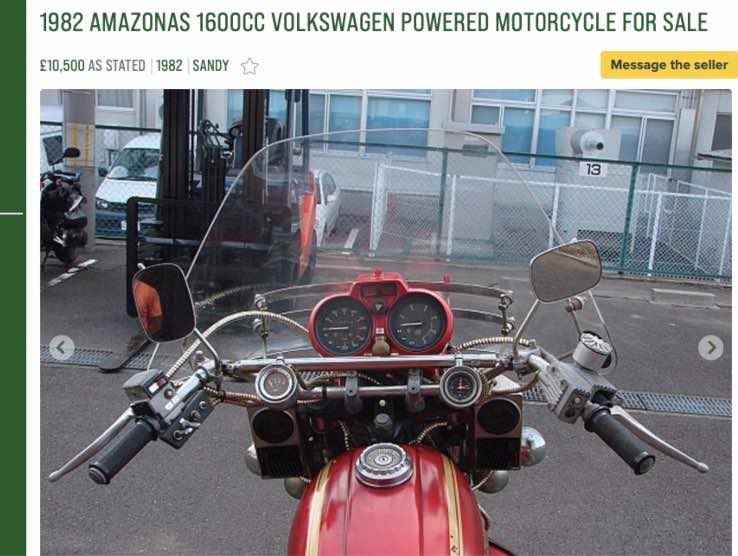 Il prezzo per la Amazonas in foto è di 10.500 Sterline e dovete quindi tener conto del cambio sfavorevole nei confronti dell’Euro italiano. Però siamo molto tentati da questa occasione: immaginate la sorpresa dei vostri amici quando chiederete loro di fare un giro in Maggiolino per poi presentarvi come dei centauri alla loro porta…