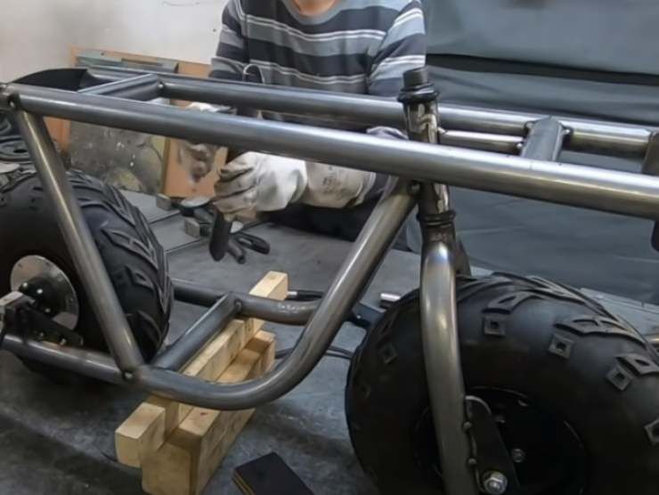 Successivamente, il nostro genio ha raccolto l’attrezzatura come i motori e le batterie necessarie. Usando una piegatubi fatta in casa per tubi da 35 mm, HennyButabi si mette al lavoro modellando cose come una forcella, un telaio e un telaio. In definitiva, questo telaio deve supportare componenti come il pacco batteria, la trasmissione e il pilota. Quindi si torna a misurare, tagliare e saldare.