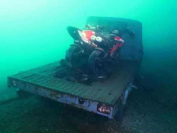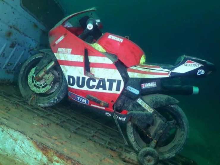 Il protagonista è il sub Lorenzo Venturini, che con le sue foto rivela quelle che sembrano due Ducati: un’auto sportiva vestita con una replica deco MotoGP del 2011, così come un modello con un telaio tubolare che ricorda molto un Hypermotard. Queste due Ducati sono trasportate su un’Ape Piaggio, utilitaria a tre ruote di piccola cilindrata imparentata con la Vespa. Storicamente, l’Ape è stata denominata VespaCar e TriVespa, con cilindrate tipicamente comprese tra 125 e 175 cc.