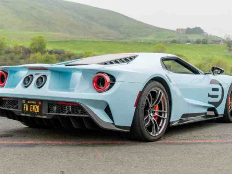 Come potete ammirare, la Ford GT Heritage Edition in questione è ricamata dalla storica livrea Gulf, famosa sia per aver colorato la macchina americana che la McLaren. La vettura inoltre non presenta incidenti o altri danni, e la revisione della divisione Performance di Ford risale all’agosto 2021. Tuttavia come vedere dalla foto ha una targa speciale, che richiama alla lotta già citata con Ferrari.