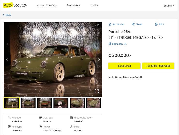 In vendita su autoscout nel momento in cui vi parliamo c’è proprio la Porsche 964 911, creazione di Strosek, al prezzo di 300mila euro. Il venditore si trova a Monaco di Baviera, e l’auto ha sulle ruote poco più di 1.000 Km percorsi.