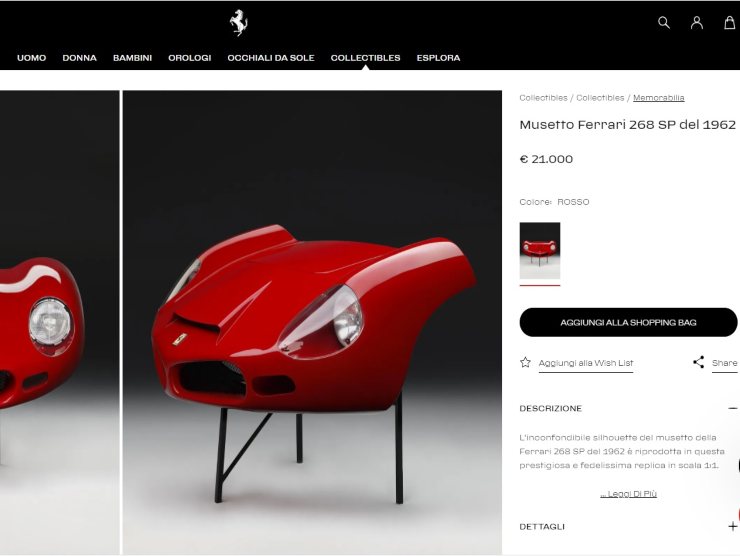 Ed adesso in Ferrari – e negli store affiliati – intendono venderla; o meglio, al Cavallino Rampante hanno deciso di mettere in vendita una replica in scala 1:1 del musetto della 268 SP dal fascino intramontabile di una vettura storica che, in ogni caso, rimane ancora oggi indimenticabile per appassionati e collezionisti.