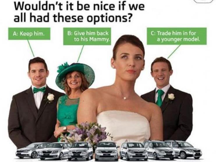 “Non sarebbe bello avere queste opzioni? A – tienitelo B – Ridallo a sua mamma C – Scambialo con un modello più giovane“, si legge nell’annuncio che ovviamente si riferisce alle opzioni di acquisto della gamma. Ma quegli sposi sul retro? Già, la casa ironizzò sul matrimonio in modo forse un po’ spinto.