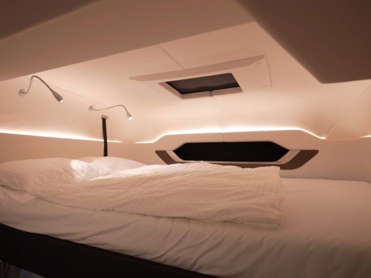 I quattro sedili del pozzetto, in splendida e terribilmente poco pratica pelle bianca, sono riscaldati, raffreddati e hanno la funzione di massaggio. Quelle posteriori ruotano verso il soggiorno, che comprende un divano perfetto sia per pranzare che per guardare la TV. La cucina, dotata di tutti gli elettrodomestici Miele tra cui lavastoviglie, piano cottura a induzione e forno, dispone anche di un grande frigorifero e congelatore, evacuazione nascosta e spazio di archiviazione generoso.