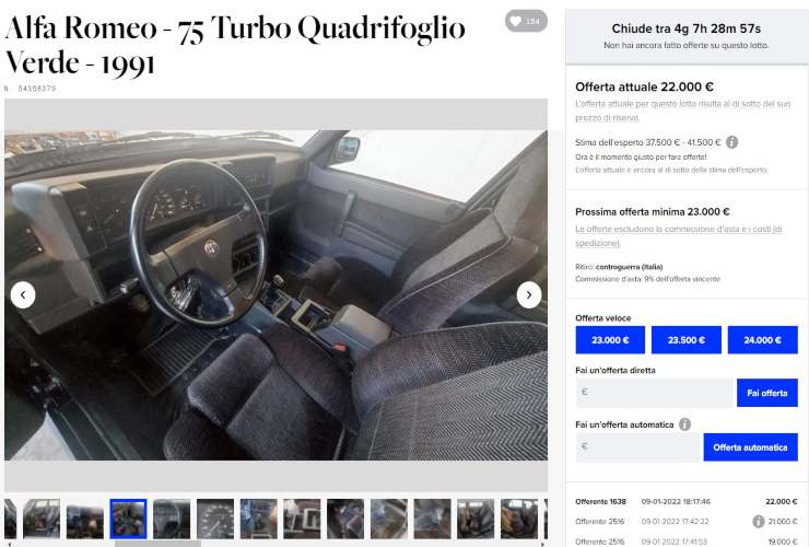 Un’auto da collezione che si trova in provincia di Teramo. Il rivenditore si accollerà tutti gli impegni burocratici. Al momento la vettura è in vendita a 22.000 €, ma secondo le stime l’asta potrebbe superare i 40mila euro.