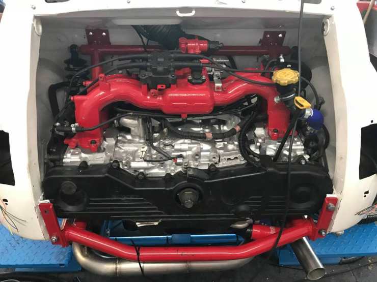 Partiamo dal cuore dell’auto, il motore. Per questa conversione è stato scelto proprio quello di una Subaru, un EJ253. Si tratta di un 4 cilindri in linea dal design compatto che per la sua conformazione ha permesso di non estirpare i sedili posteriori della vettura rendendola utilizzabile anche da 4 persone.
