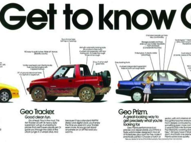Fondamentalmente, Geo era un marchio dedicato alla distribuzione di vetture straniere: non che Geo abbia mai plagiato un’automobile ma la GM si assicurò accordi di mercato con case come Toyota e Suzuki per una joint-production di vetture come la Metro, vagamente simile alla Suzuki Swift dell’epoca o la Tracker che si ispirava chiaramente alla Vitara ma esibiva anche una livrea fosforescente, su richiesta, pacchiana come poche cose.