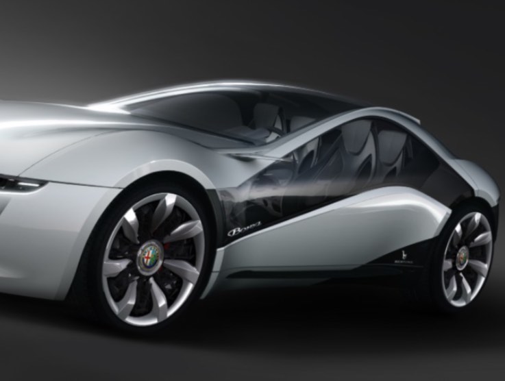 L’automobile con le portiere aperte sembra l’esoscheletro di una sportiva Alfa con due sedili all’interno, anch’essi alleggeriti nelle forme forniti di una appariscente illuminazione interna e dipinti di un ipnotico color acquamarina che contrasta con la tinta bianca dell’unico esemplare mai realizzato e presentato al Motor Show di Ginevra del 2010.