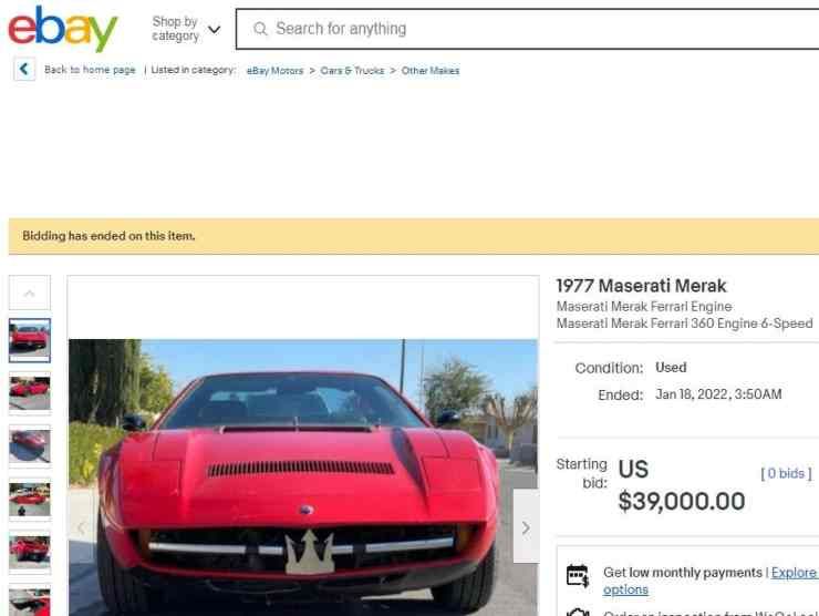 Con oltre diecimila esemplari prodotti, si tratta di uno dei maggiori successi commerciali della casa del Cavallino Rampante, seconda solo alla Ferrari California. Si giustifica anche così il prezzo con cui questa Maserati Merak era proposta su Ebay: ben 39.000 dollari. Circa 34mila euro. Ma l’offerta in questo momento è chiusa.