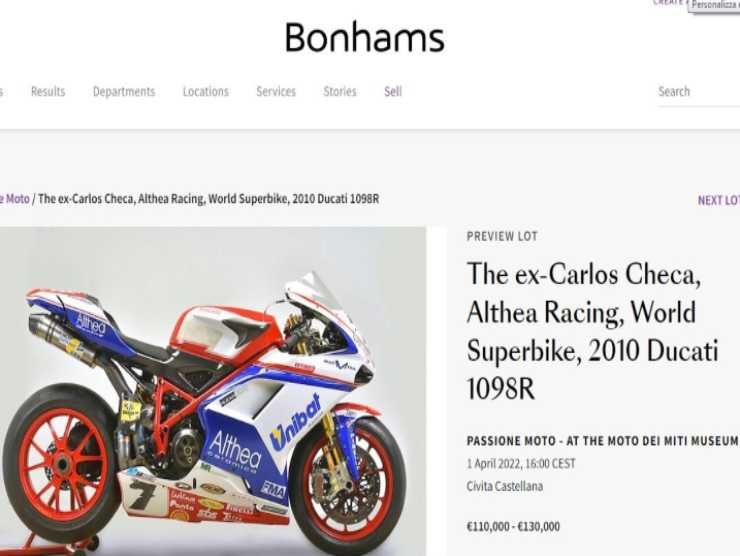 E quella che abbiamo trovato in vendita sul portale d’aste Bonhams è proprio una Ducati. La 1098R. Non quella del 2011, l’anno vincente di Carlos Checa. Ma quella del 2010, l’anno antecedente al trionfo, in cui, in un certo senso, il pilota ha costruito il proprio successo. In quella stagione, infatti, Carlos Checa arriverà terzo nella classifica generale.