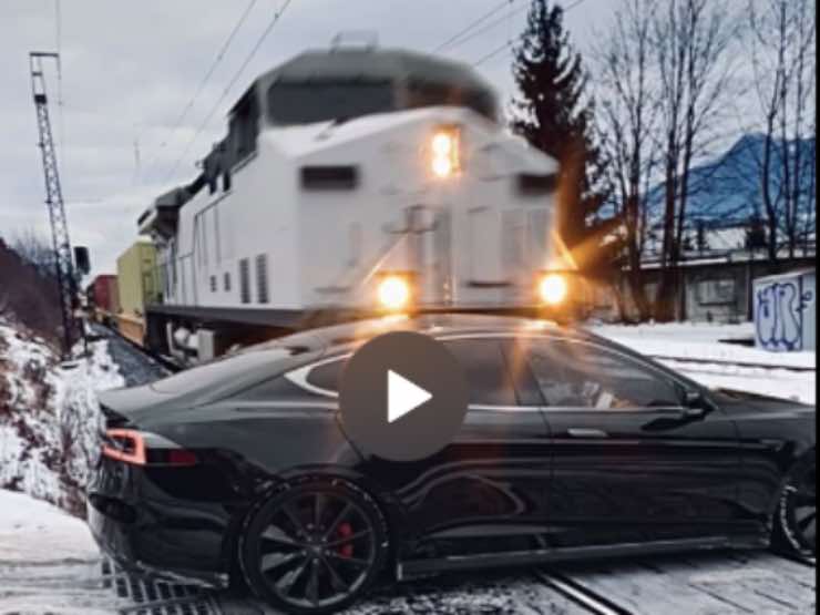 Nel video pubblicato su Instagram vediamo la Tesla avventurarsi sui binari non protetti dalle barriere regolamentari in un tratto di strada innevata, proprio mentre sopraggiunge a tutta velocità un treno merci, lanciato sui binari! Il pilota sembra non accorgersi di niente e anzi, rallenta, fermandosi proprio sui binari. E’ la fine? Stiamo per assistere ad un terrificante caso di cronaca?