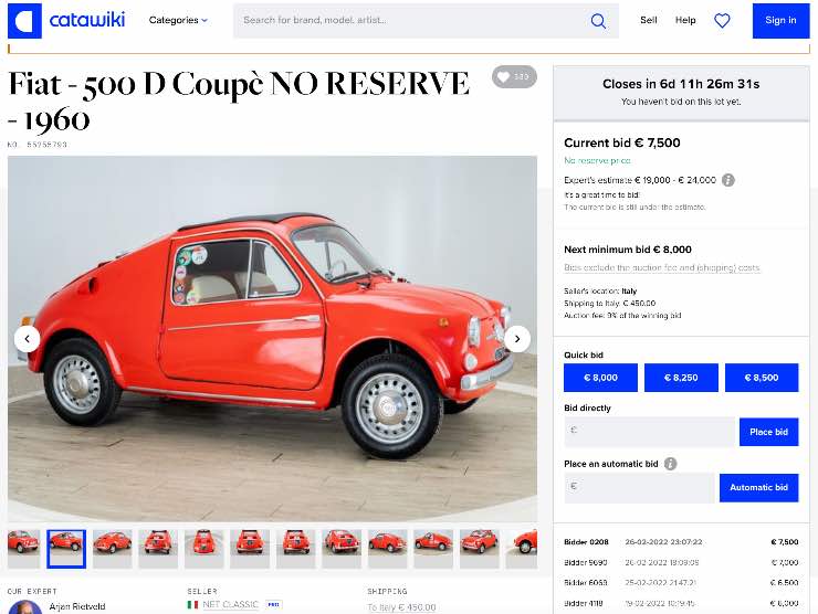 Ciò che è interessante è certamente il prezzo. Su Catawiki, infatti, la Fiat 500 in versione coupé (che si trova ovviamente in Italia) è offerta a 7.500 euro. Offerte che si sono succedute negli ultimi giorni, come è possibile verificare su Catawiki. Gli esperti stimano che per portarsela a casa potrebbe servire una cifra compresa tra i 19 e i 24mila euro. Il trasporto in Italia ha un costo di 450 euro.