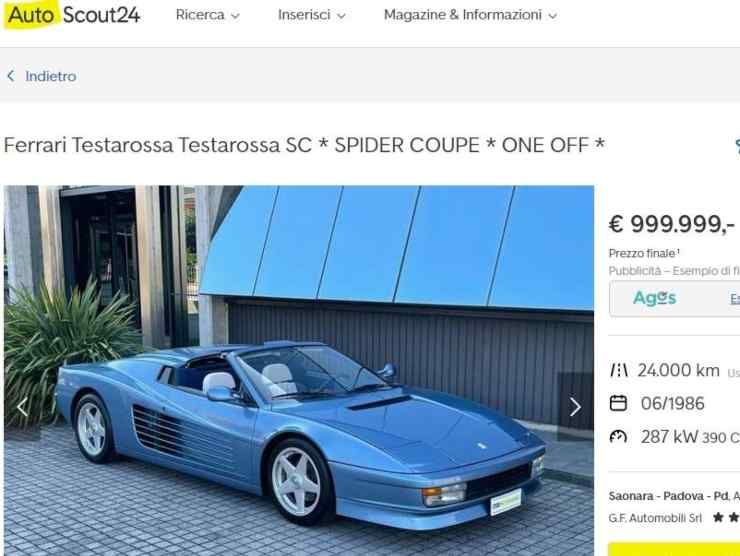 La Ferrari Testarossa che vi proponiamo ha percorso 24mila chilometri. Ma non fatevi spaventare dal prezzo contrassegnato su AutoScout 24, poco meno di un milione di euro. La cifra è indicativa, in quanto la trattativa sarà affrontata privatamente.