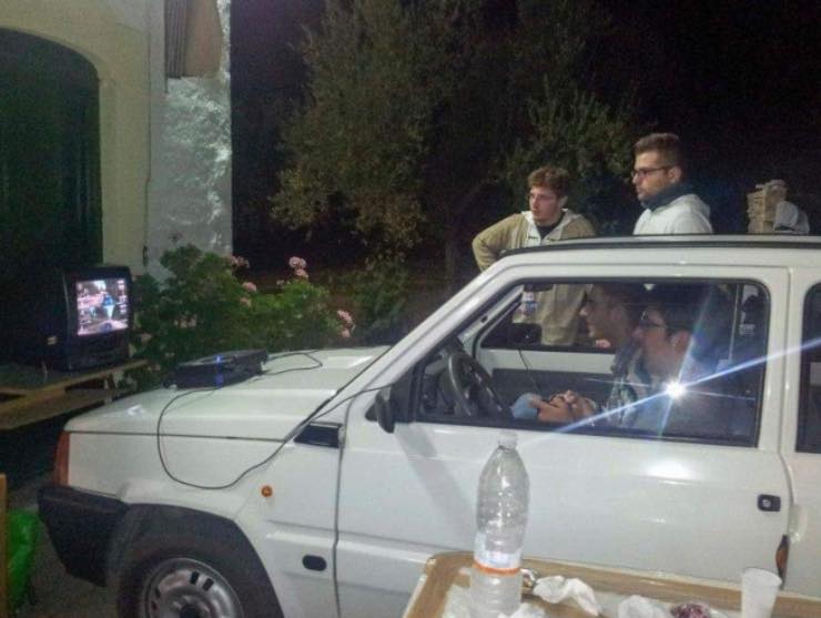 I ragazzi infetto hanno allestito un drive in in casa utilizzando la loro Fiat Panda. Ma non tutto: al posto del classico maxi schermo c’è un’improbabile, piccola televisione da camera a cui è attaccata una vecchia Playstation 2. Il videogioco scelto per l’occasione? Un simulatore di guida, ci pare ovvio. Ed ecco che un idea apparentemente banale trasforma la serata del gruppo in qualcosa di originale.