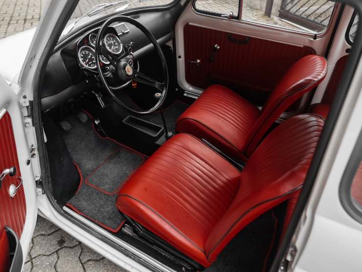 La Fiat Abarth 595 che oggi vi presentiamo è di colore bianco. Sedili rossi ripristinanti a nuovo, come i pannelli delle portiere. Plancia nera 595 con strumentazione funzionante. Tettino apribile restaurato. La vettura è del 1970, quindi di appena un anno prima rispetto alla fine della commercializzazione del modello.