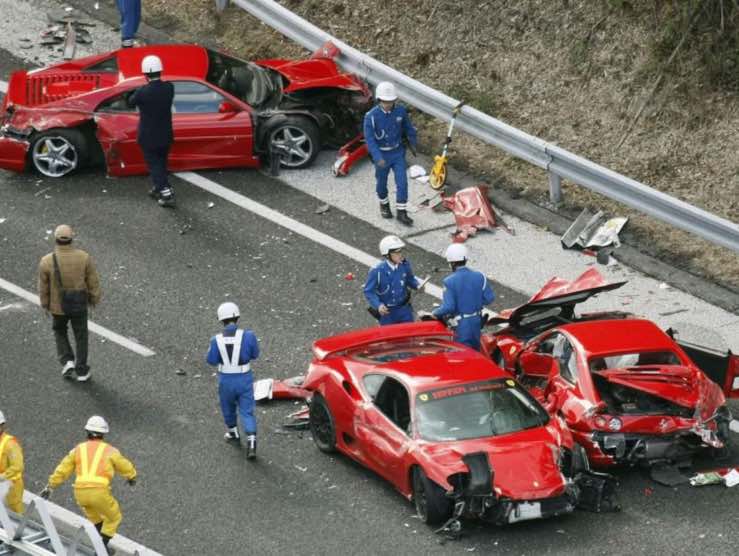 “Non ho mai visto così tante Ferrari distrutte tutte insieme”, ha detto il capo della polizia della prefettura locale intervenuto con i suoi uomini per sgomberare la strada di campagna dove si è svolto lo scontro. Secondo i testimoni, le auto viaggiavano ad almeno 160 chilometri orari in gruppo quando una Ferrari ha cambiato corsia senza mettere la freccia, scatenando la carambola.