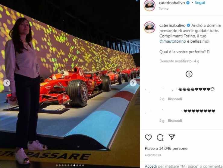 E, ovviamente, spazio alle Ferrari. La nostra Caterina Balivo ne immortala una d’epoca. Ma poi non resiste a uno scatto insieme alle monoposto da Formula 1. Indubitabile che sia molto invidiata dagli appassionati di motori e automotive.
